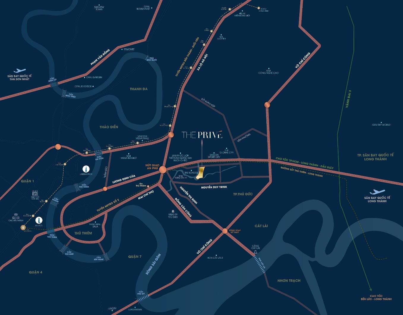 The Privé sở hữu vị trí tại trung tâm Quận 2 (TP. Thủ Đức), liền kề Khu đô thị Thủ Thiêm và các trục giao thông huyết mạch.